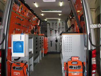 | Innenansicht des Bahco-Werkstattwagens | Dachschneider & Vakuumhebeanlage |