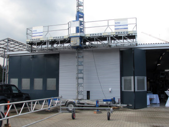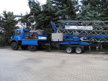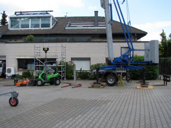 | Unimog U 2400 & Turmdrehkran Blitz-Lift | Klettermastbühne & mobile Absturzsicherung vor der Werkstatthalle |